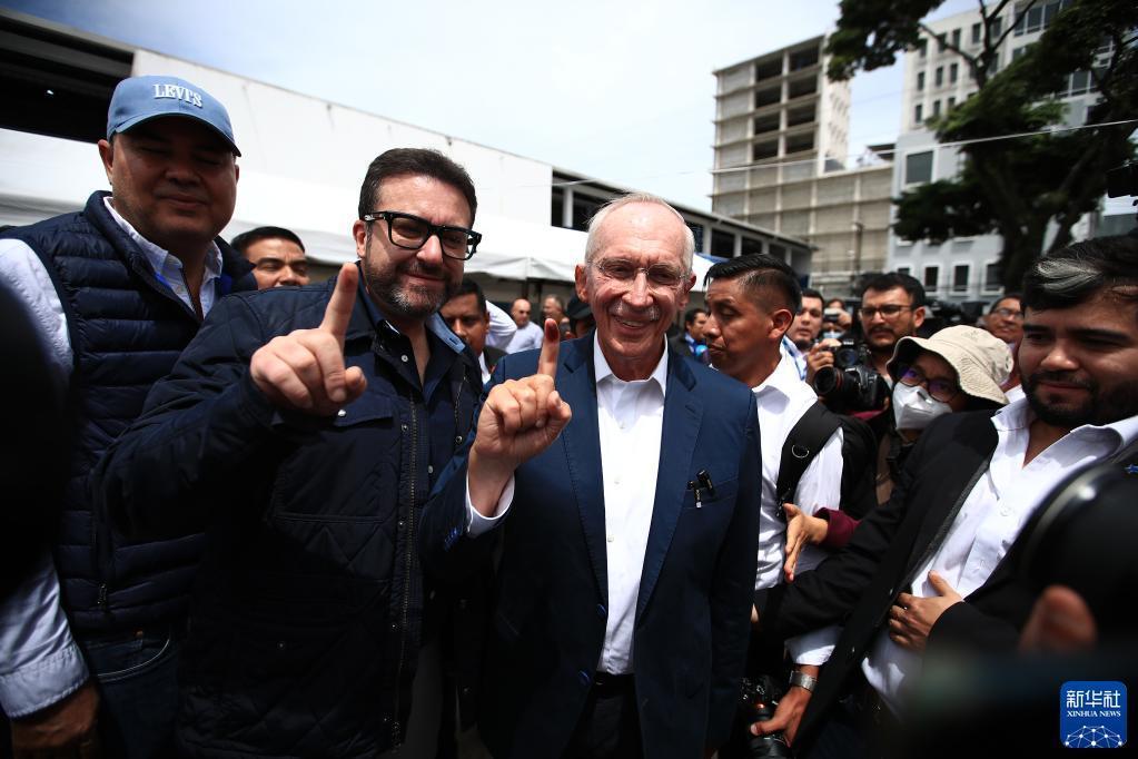 6月25日,曾擔任聯合國前秘書長潘基文辦公室主任的“Cabal”黨候選人埃德蒙·穆萊特(左三)在危地馬拉首都危地馬拉城一處投票站參加投票。