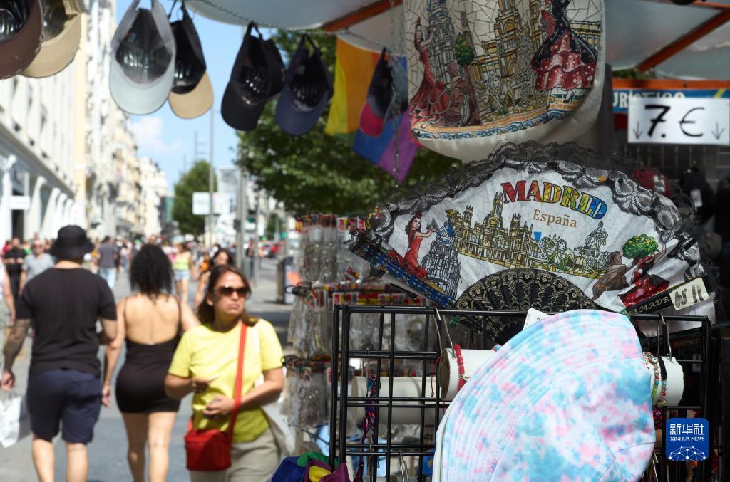這是6月25日拍攝的西班牙馬德里市中心一處報刊亭出售的扇子和帽子。