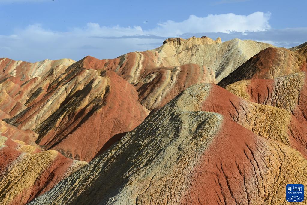 盛夏時節,甘肅省張掖市七彩丹霞景區在藍天白云的映襯下氣勢磅礴,色彩艷麗。