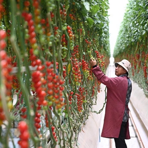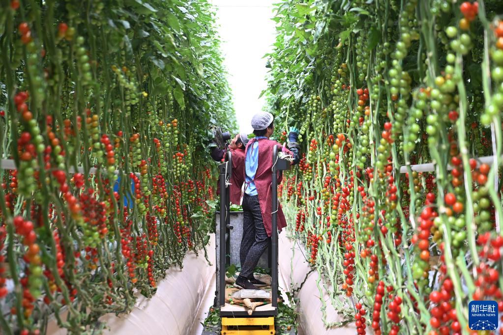 近年來,地處祁連山北麓、河西走廊中段的甘肅省張掖市民樂縣充分挖掘戈壁農業資源潛力,大力發展節水農業、旱作農業、戈壁生態農業,建設百億級現代絲路寒旱農業智能溫室產業園。截至目前,該縣已建成投用50萬平方米的高標準智能玻璃溫室,種植的串收番茄銷往我國華東、華南等區域。