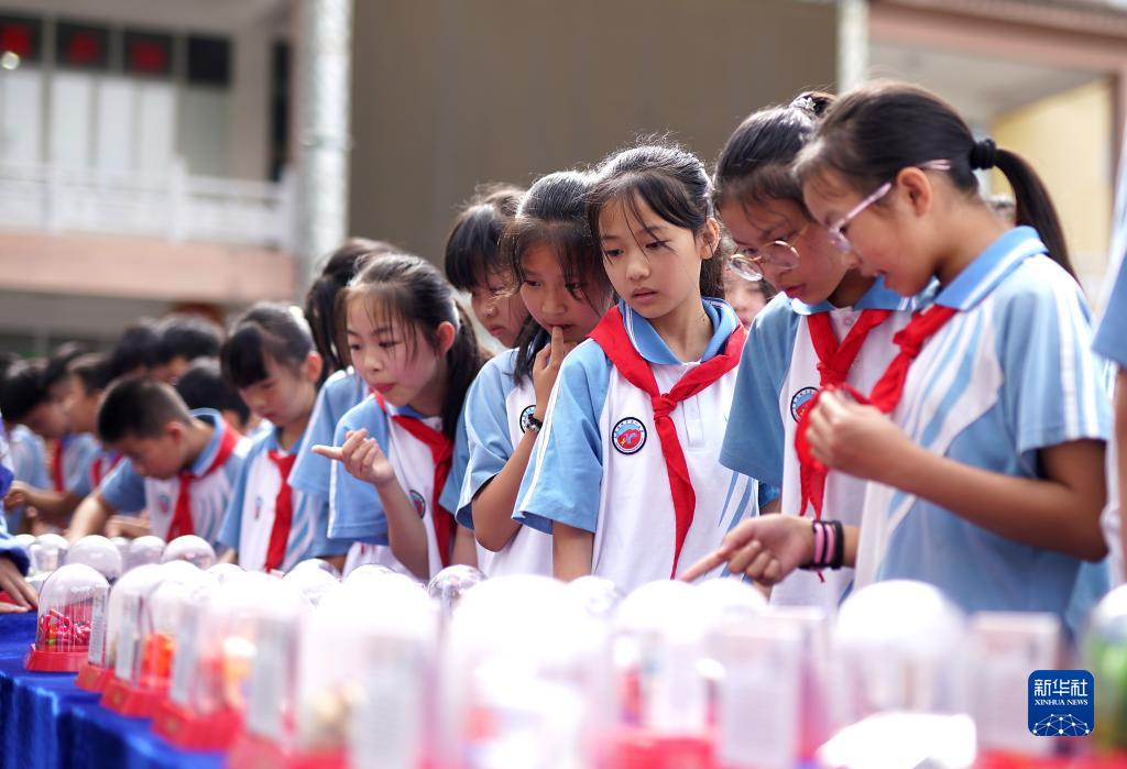 6月26日,小學生在貴州省黔東南苗族侗族自治州丹寨縣“6.26國際禁毒日”宣傳教育活動現場通過仿真毒品模型識別毒品。