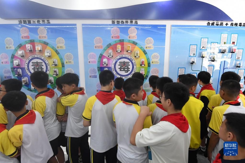 6月26日,小學生在廣西河池市羅城仫佬族自治縣第二小學校園禁毒教育基地了解禁毒知識。