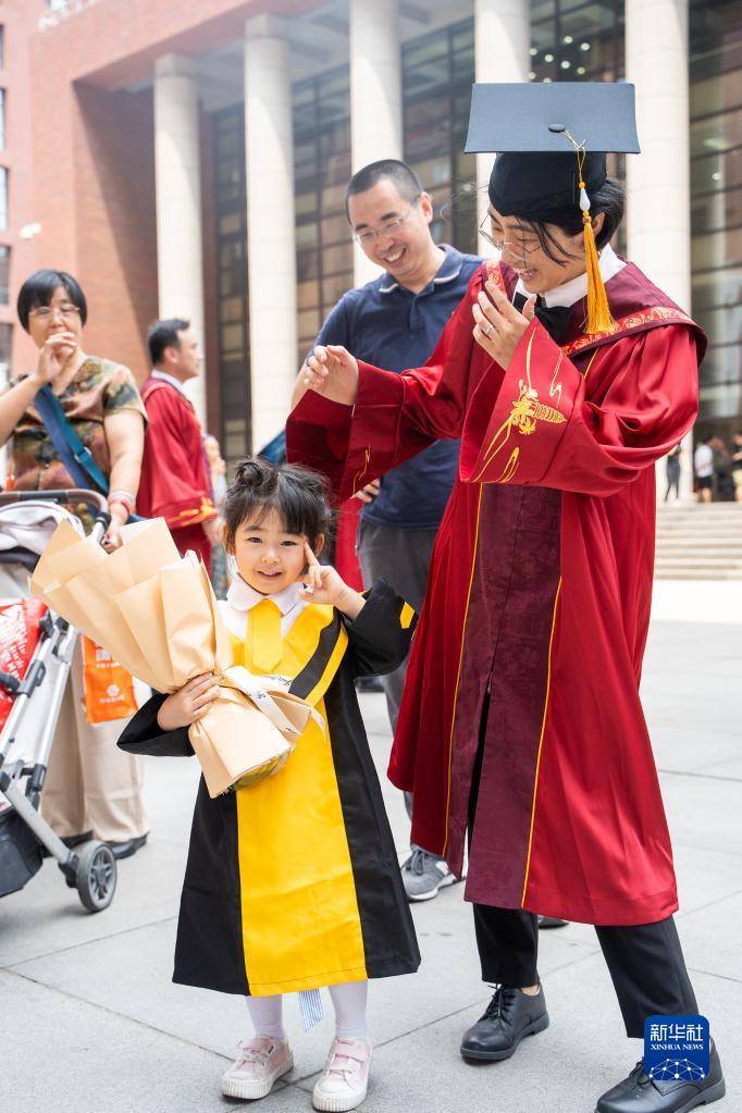 6月26日,中國人民大學一名畢業生帶著孩子參加典禮。
