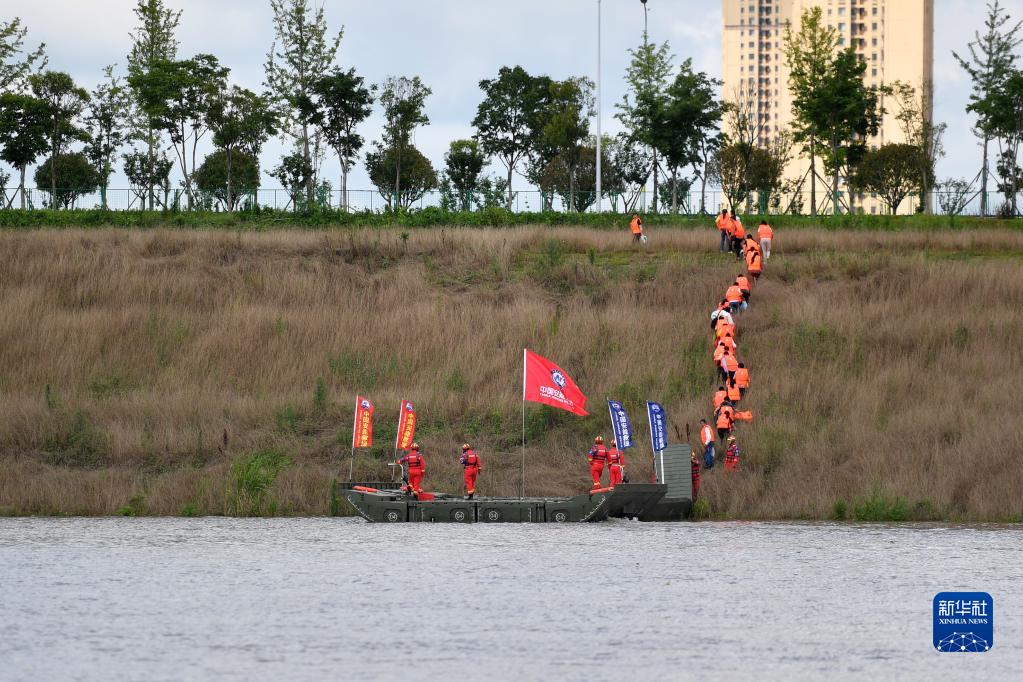 6月26日,防汛搶險應急演練人員利用應急動力舟橋轉移“被困群眾”。