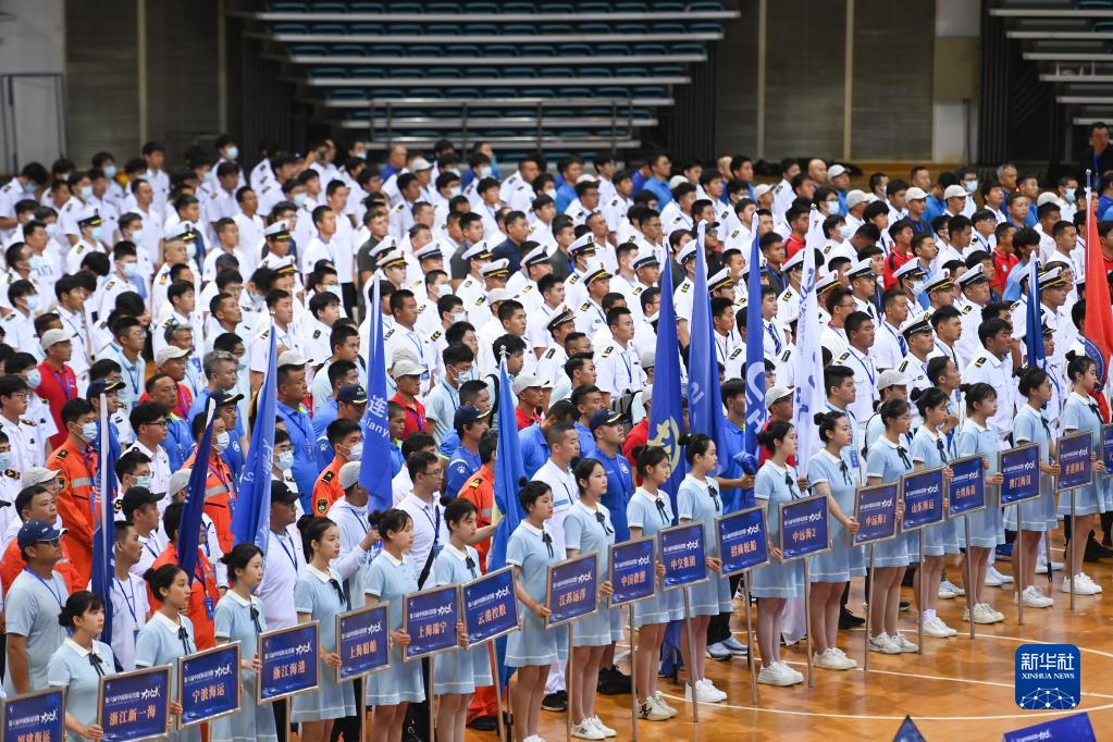 6月26日,參賽隊伍在浙江舟山體育館參加第六屆中國海員技能大比武開幕式。