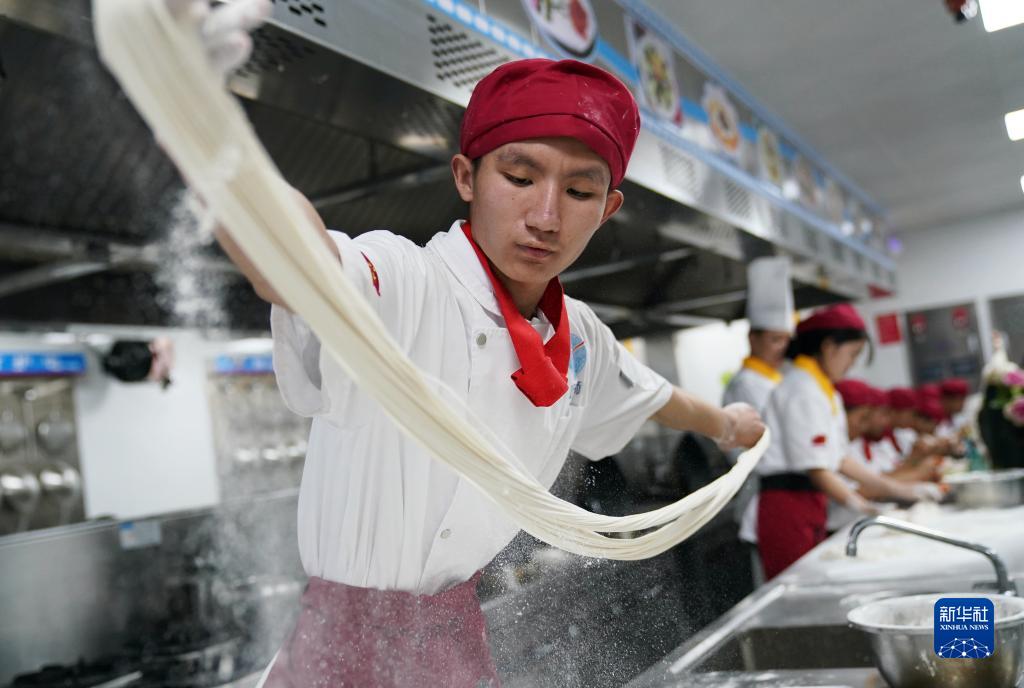 6月25日,在位于西安市藍田縣的藍田廚師學校中式面點實訓室,學生在練習制作面條。
