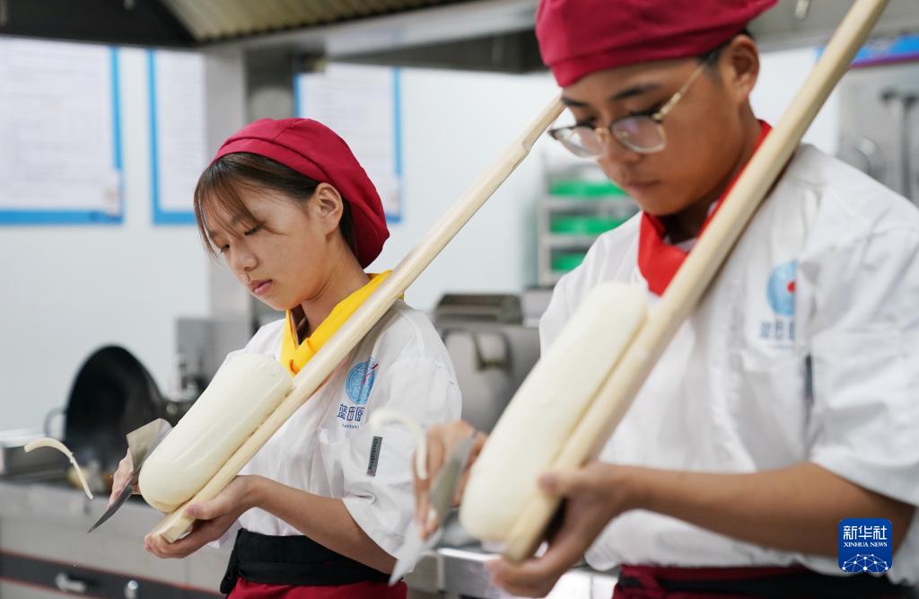 6月25日,在位于西安市藍田縣的藍田廚師學校中式面點實訓室,學生在練習削面。