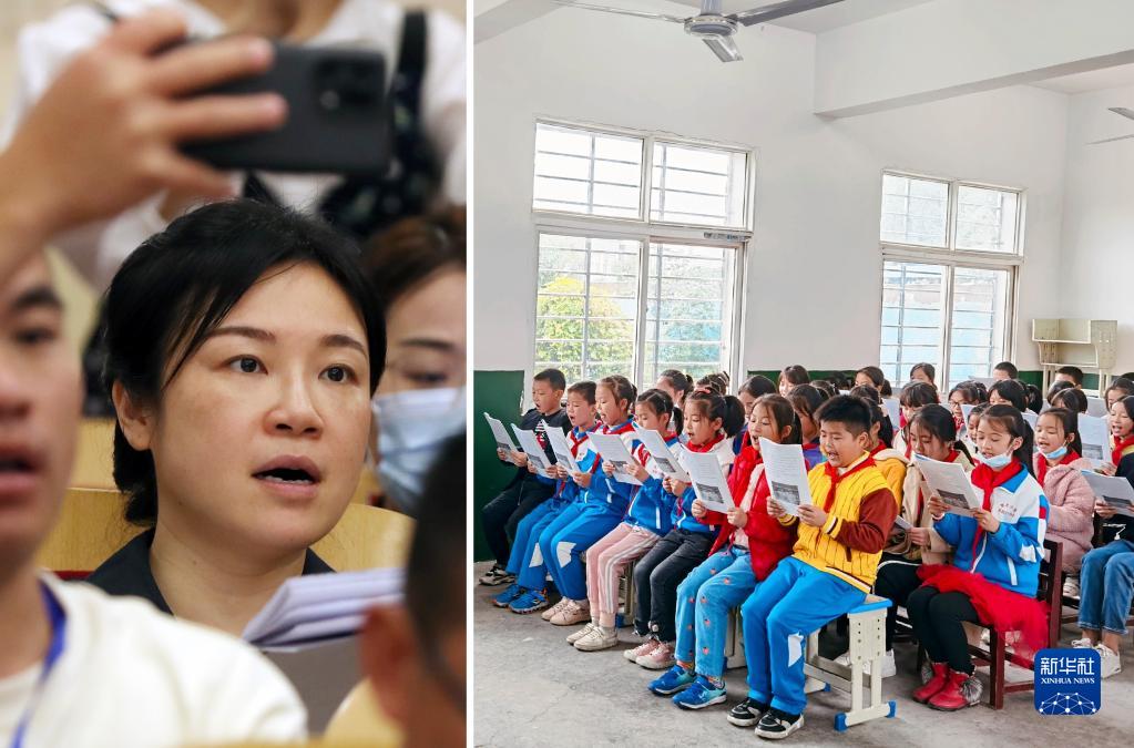 這是一張拼版照片:左圖為6月23日,湖北省天門市育才小學的音樂教師黎丹在培訓課上(新華社記者劉穎攝);右圖為育才小學雙剅口分校合唱團在排練,該校是國家級非物質文化遺產“天門民歌”的傳承基地,黎丹老師將天門民歌與合唱團教學相結合,助力非遺傳承(受訪者供圖)。