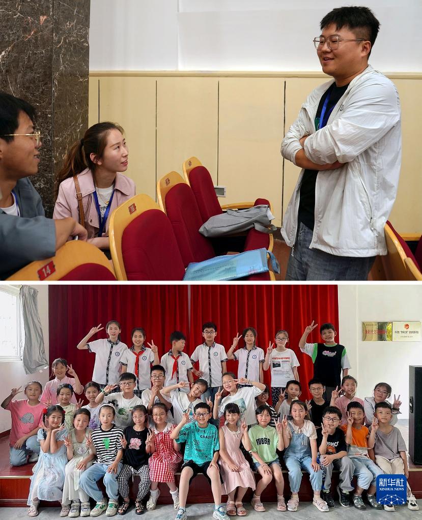 這是一張拼版照片:上圖為6月23日,參加培訓的安徽省六安市舒城縣曉天鎮中心小學的音樂教師翟緒磊(右)與其他學員交流(新華社記者劉穎攝);下圖為曉天鎮中心小學由翟緒磊老師組建并指導的曉小少年合唱團(受訪者供圖)。