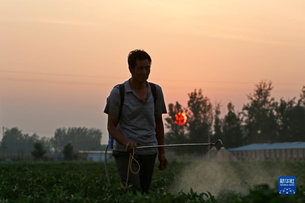 6月25日,村民在河南省安陽市內黃縣龍慶街道西沈村的辣椒田里噴灑農藥。