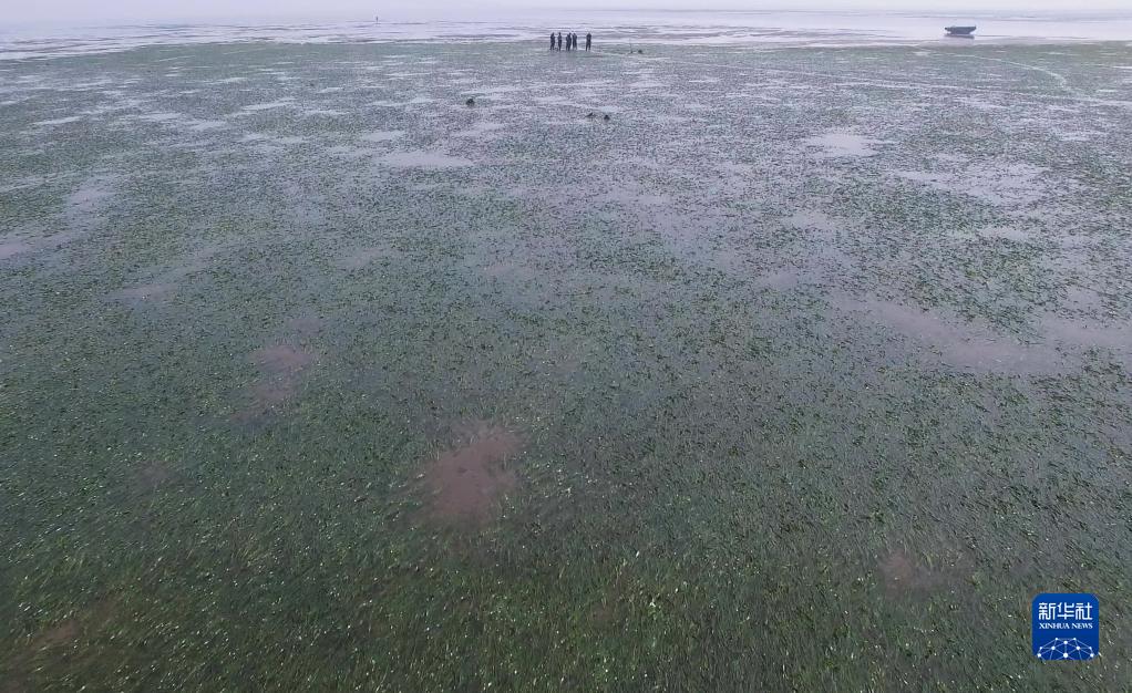 唐山祥云灣海洋牧場的技術人員在察看鰻草海草床的情況(2021年8月11日攝)。