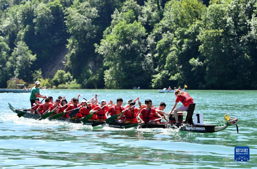 6月25日,在瑞士埃格利紹,瑞士蘇黎世州華僑華人組織的“龍戰隊”參加賽龍舟活動。