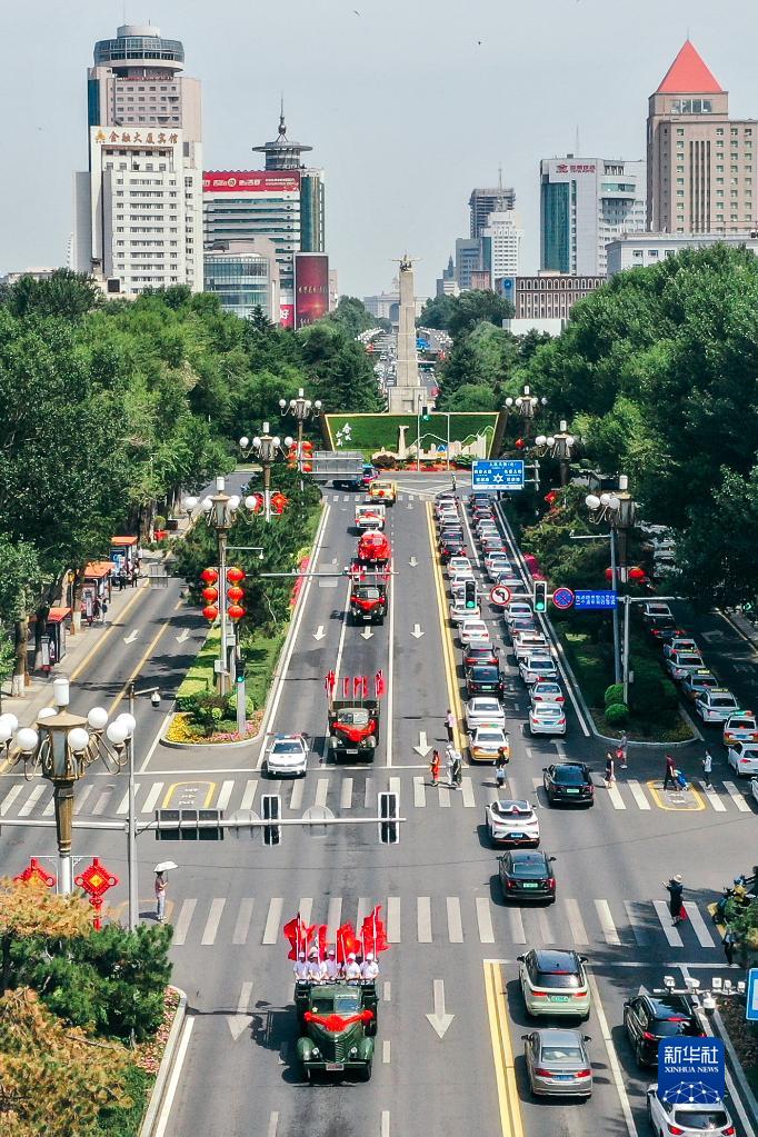 6月26日,一汽解放卡車行駛在長春的街道上(無人機照片)。