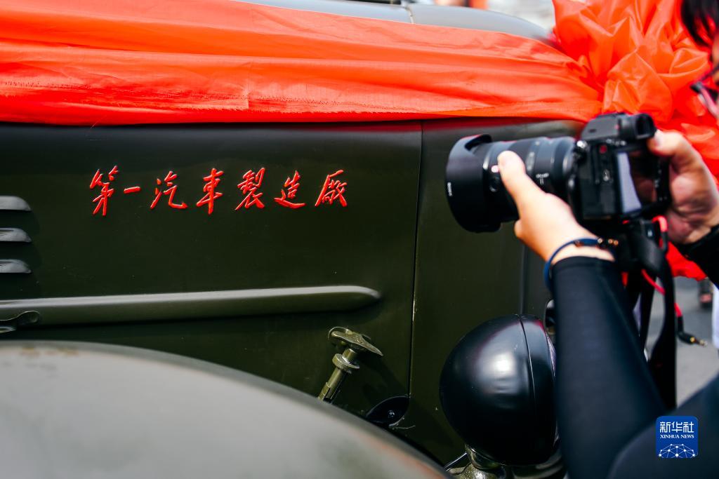 6月26日,一名媒體記者在活動現場拍攝一汽解放第一代產品CA10型號卡車車身上的“第一汽車制造廠”字樣標識。
