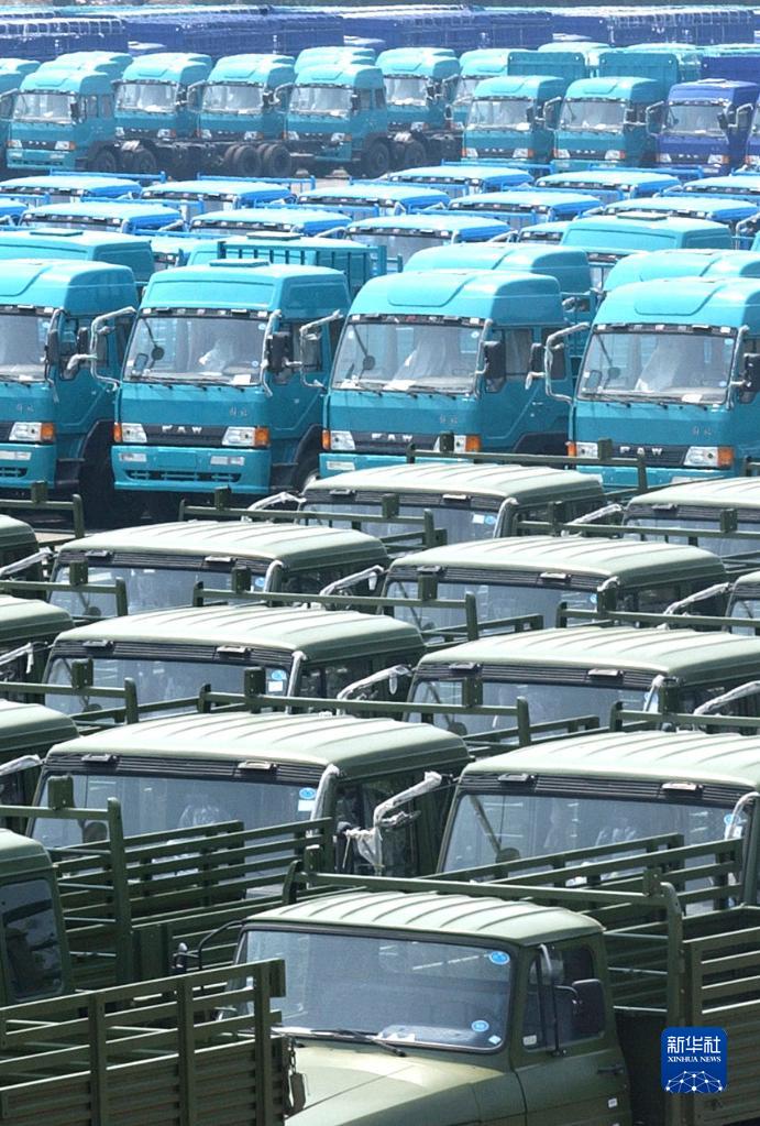 這是2003年7月13日拍攝的中國第一汽車集團等待外運的“解放”卡車。