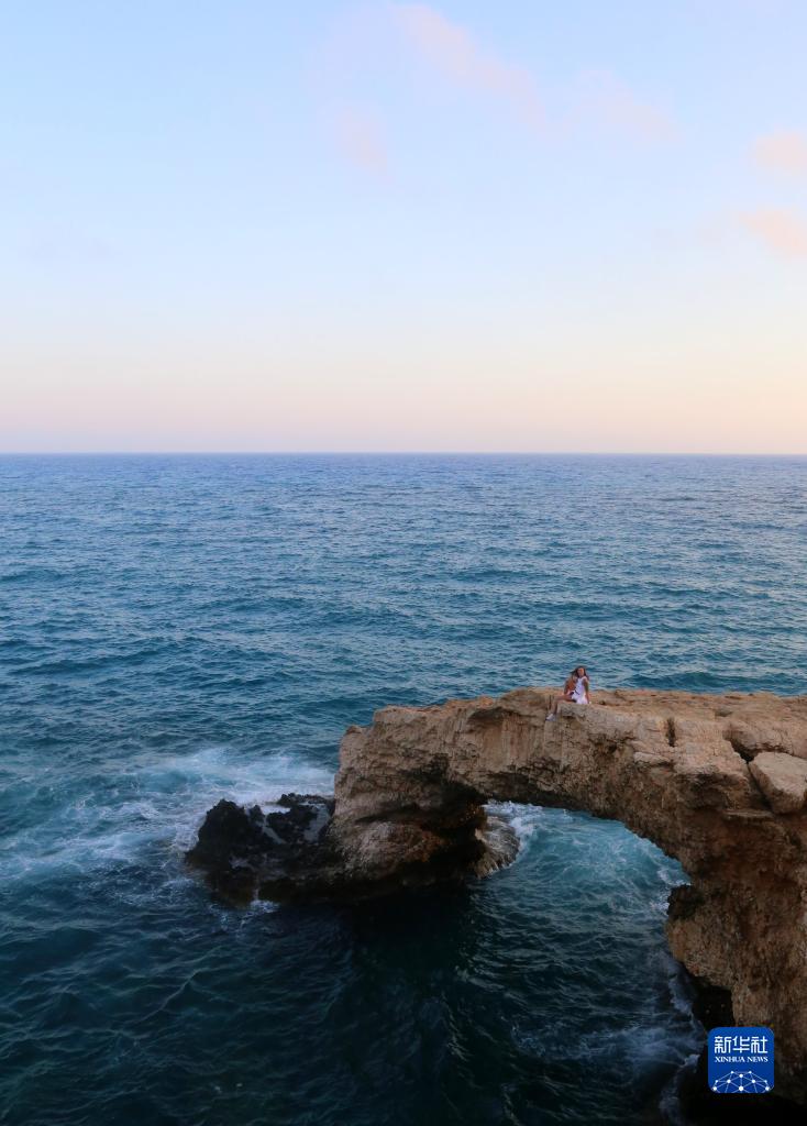 在塞浦路斯圣納帕東部海蝕洞景區,一處海岸邊海水侵蝕后形成的天然石橋“愛之橋”因美麗的景色成為游客打卡地。
