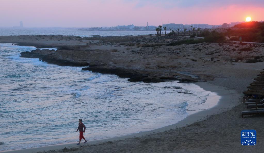 這是6月26日在塞浦路斯圣納帕“愛之橋”附近拍攝的海邊落日。