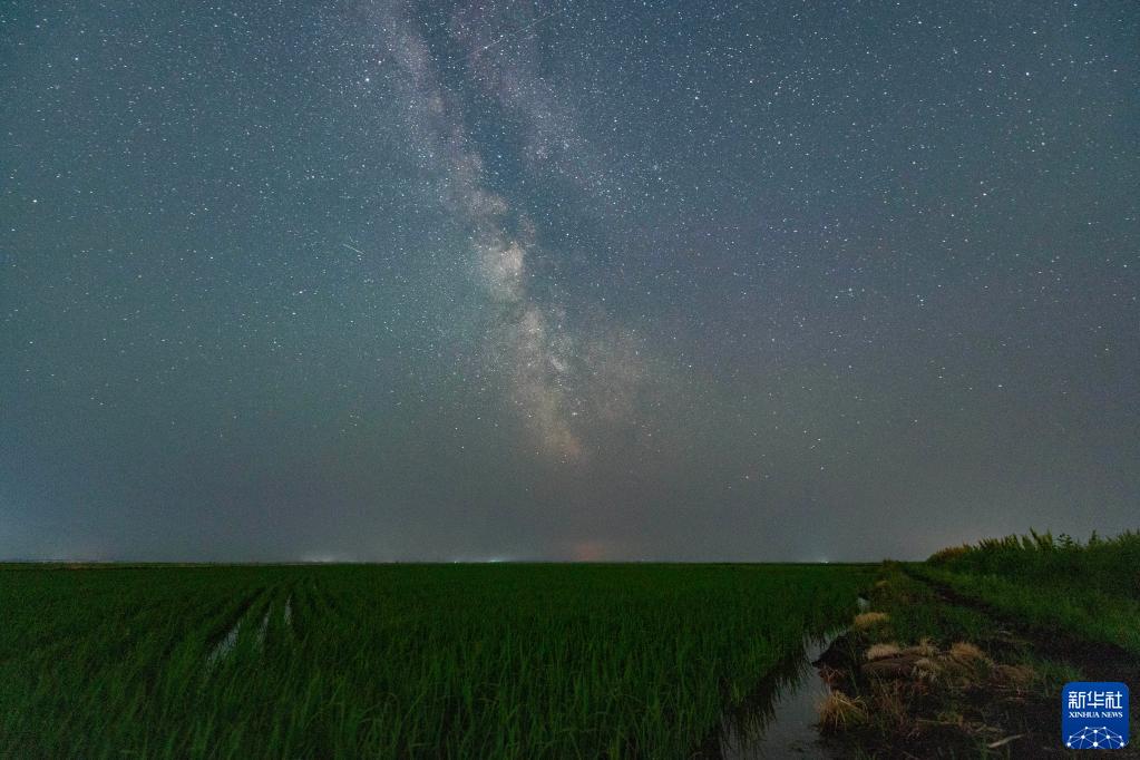 夏日夜晚,黑龍江省富錦市萬畝水稻公園的稻田之上星空璀璨,美麗壯觀。