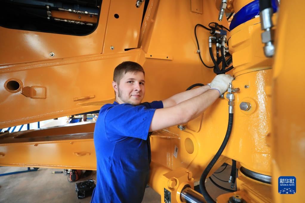 6月26日,工人在白俄羅斯明斯克州若基諾市的白俄羅斯汽車制造廠大型自卸車組裝車間工作。