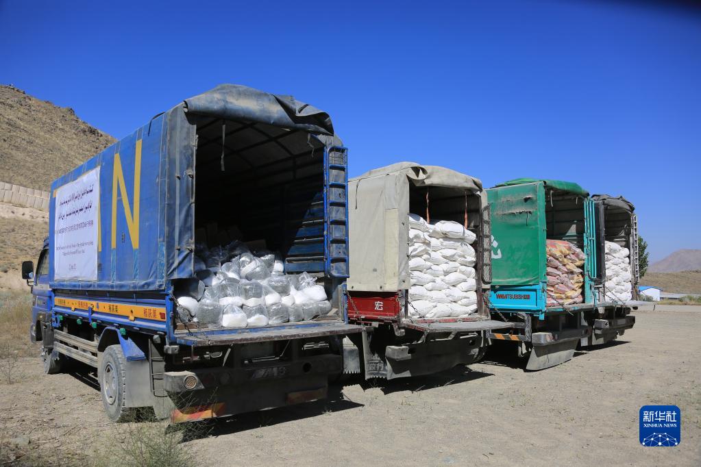 這是6月21日在阿富汗盧格爾省拍攝的中國中冶集團艾娜克銅礦項目捐贈的宰牲節過節物資。