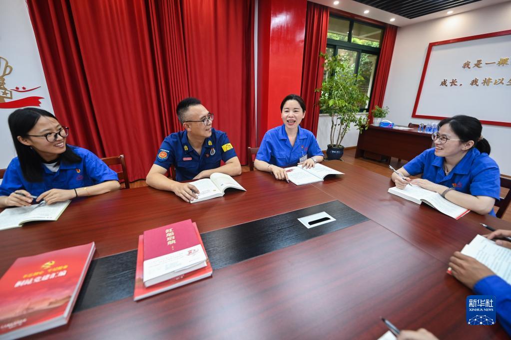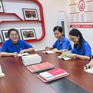 6月27日,胡曉麗(右二)等黨員職工在桐昆集團的工作室內開展主題黨日活動。