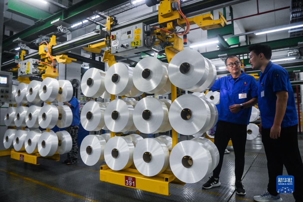 6月27日,在桐昆集團浙江恒超化纖有限公司聚紡車間內,黨支部書記戚黎洲(左)指導新員工學習質檢流程及要點。