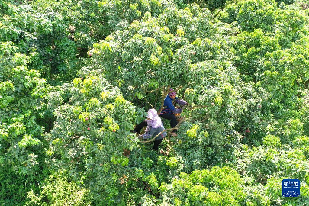 6月27日,廣西北流市北流鎮六行村村民在采摘荔枝(無人機照片)。