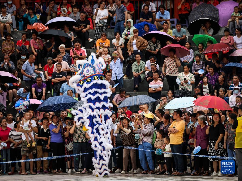 6月27日,在廣西環江毛南族自治縣下南鄉毛南民族文化園,村民觀看舞獅表演。