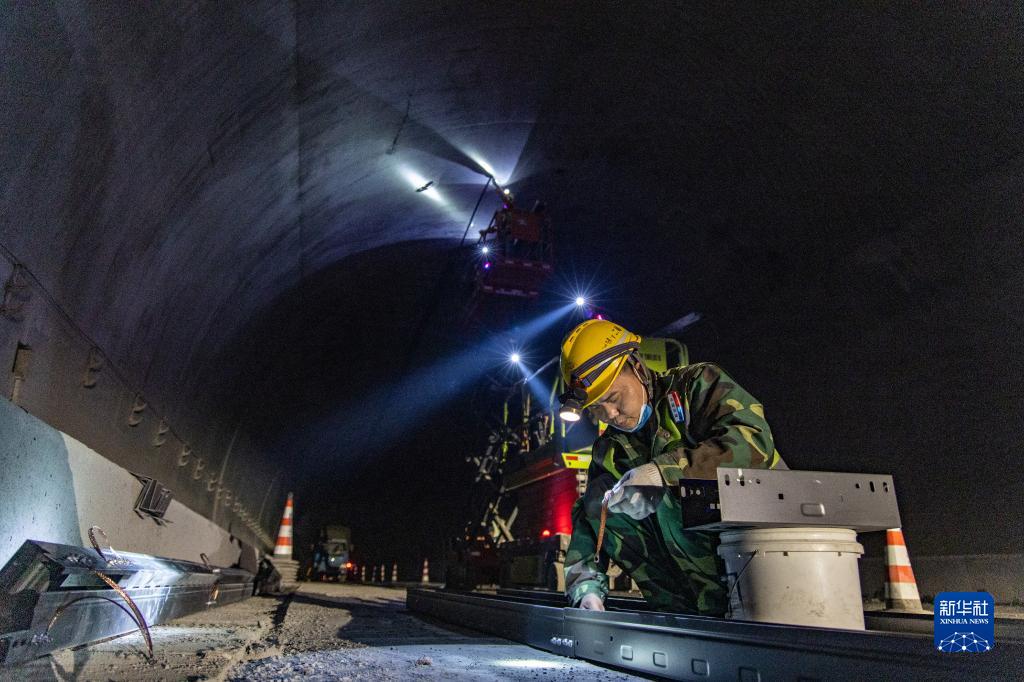 6月27日,在巫鎮高速公路二標段施工現場,施工人員在進行隧道橋架施工。