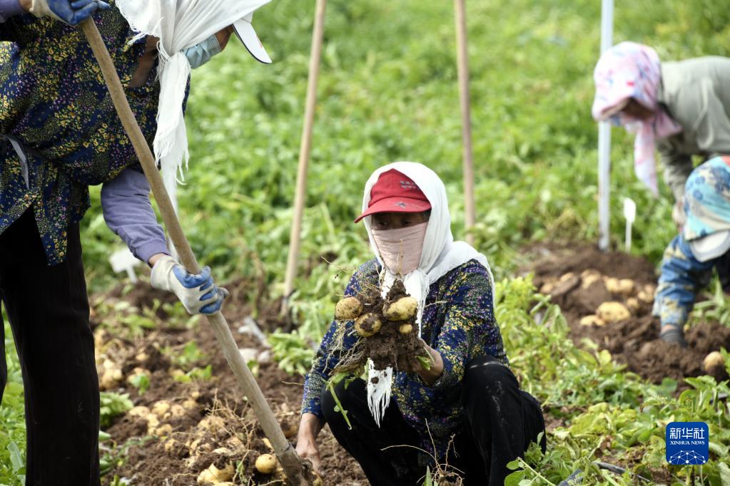 6月27日,工作人員在示范基地收獲馬鈴薯。
