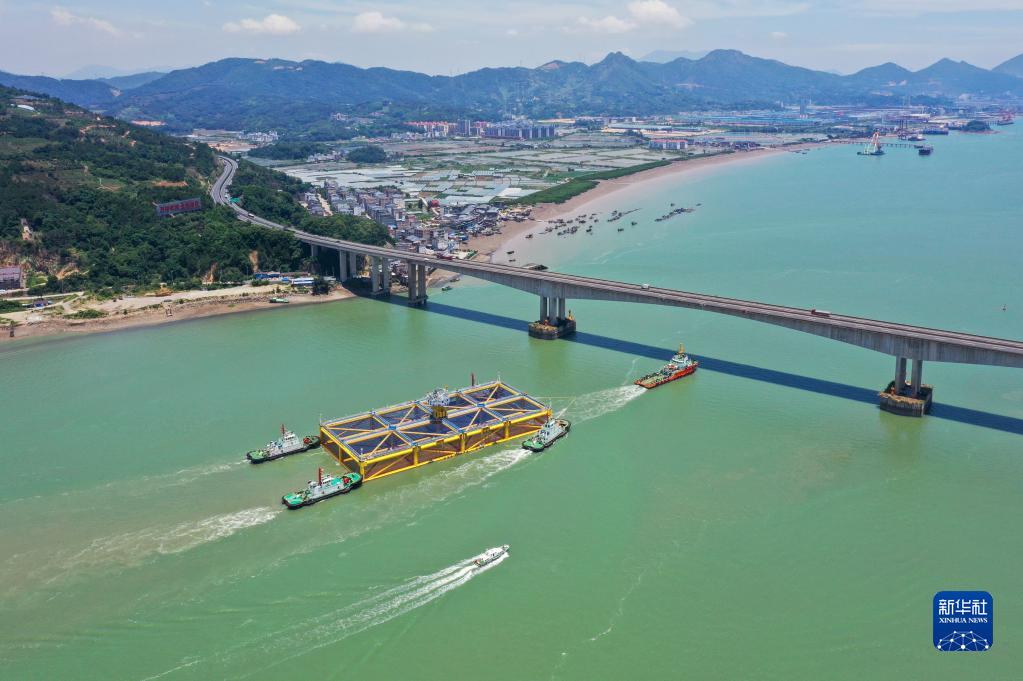 6月27日,深遠海養殖平臺“寧德1號”在拖輪協助下通過沈海高速下白石特大橋(無人機照片)。