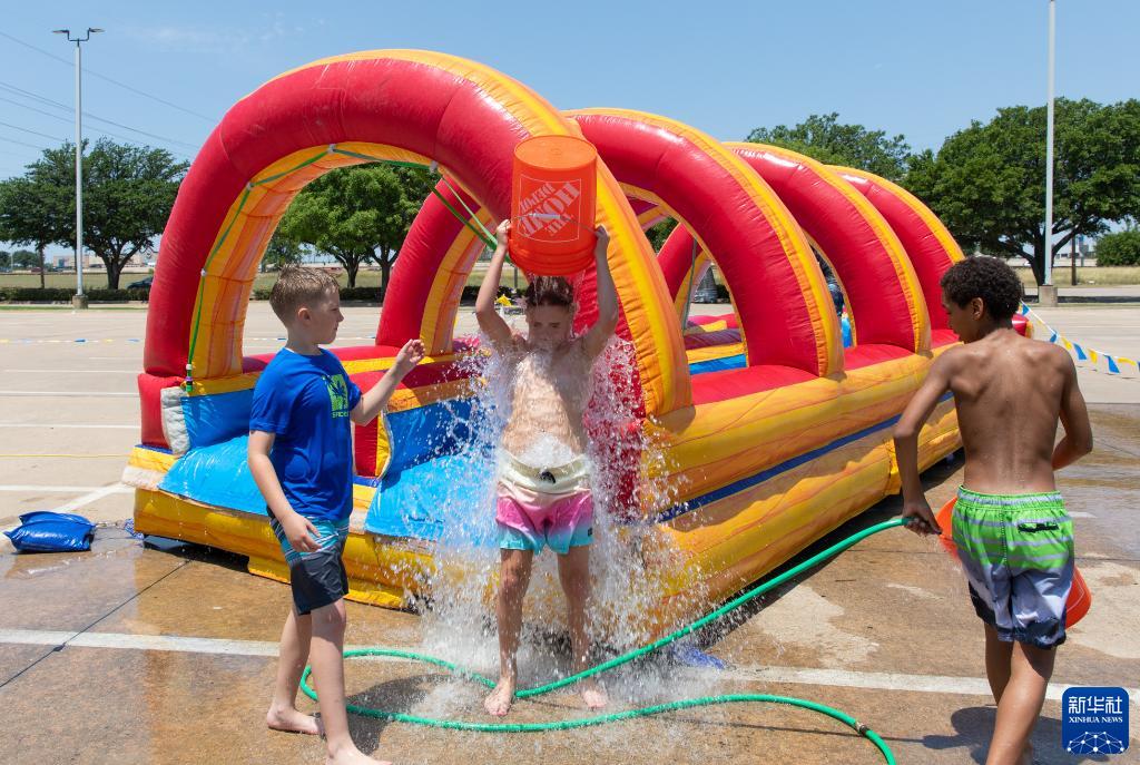 6月27日,在美國得克薩斯州達拉斯市郊,兒童在玩水。
