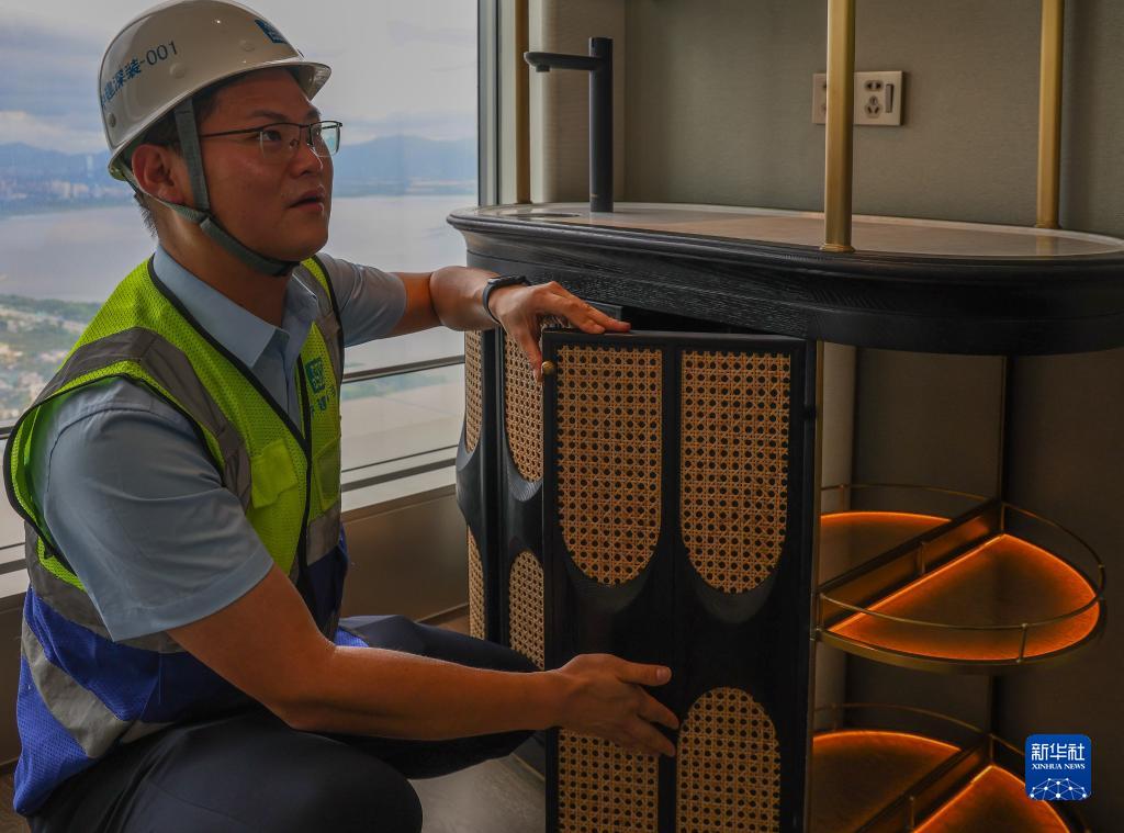 伍濤和同事對他們選擇的酒店客房藤編主題家具呈現效果進行討論(6月26日攝)。