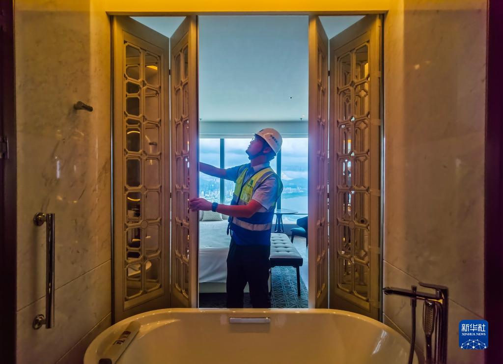 伍濤在客房檢查滿洲窗燭花玻璃折疊門的開合順暢度(6月26日攝)。