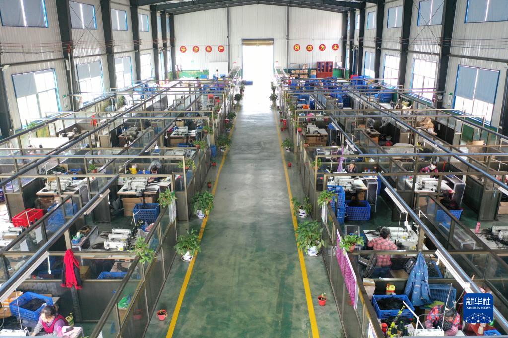 5月25日,工人在湖南邵陽美麗來發制品有限公司車間內生產假發(無人機照片)。