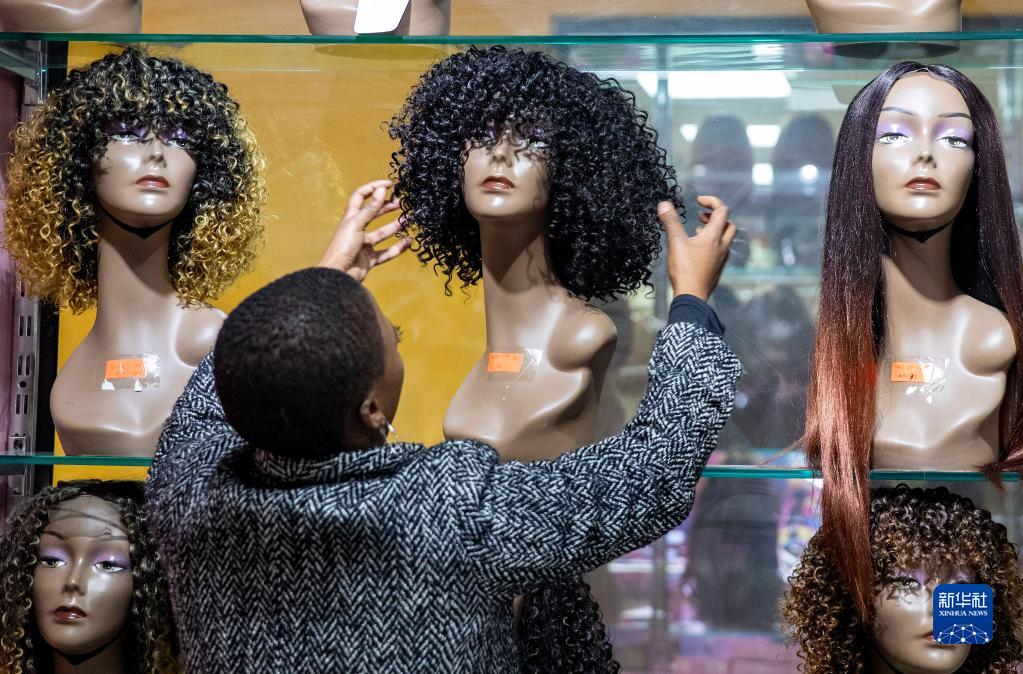 6月9日,在湖南邵陽美麗來發制品有限公司位于南非約翰內斯堡的店鋪內,一名店員在整理展示的假發。