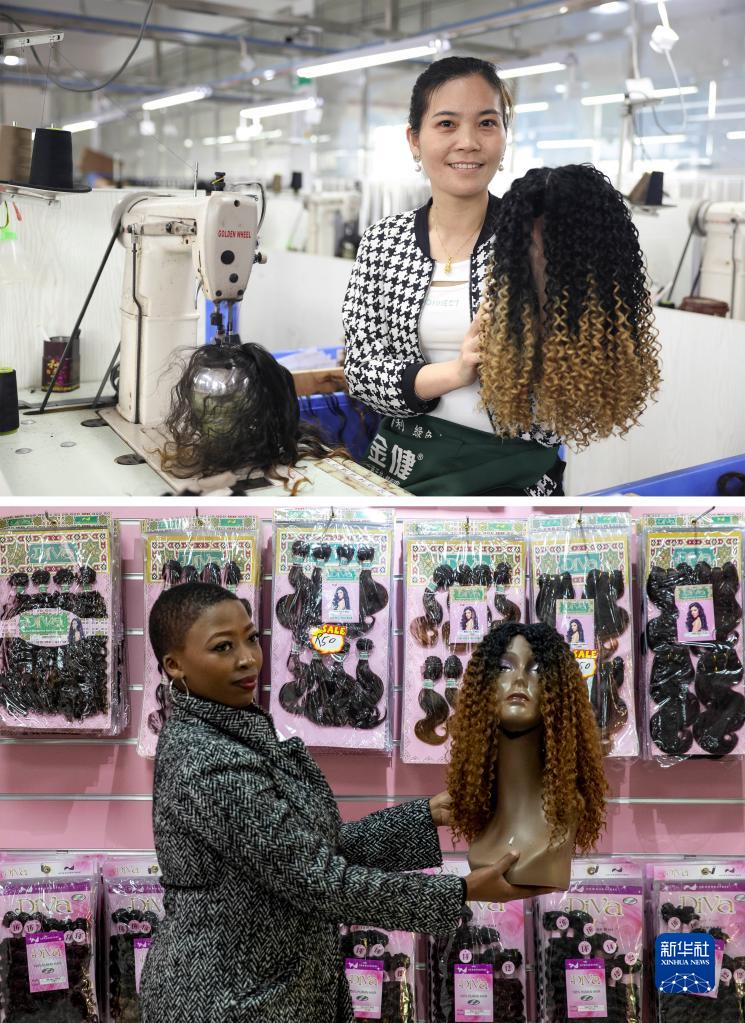 拼版照片:上圖為5月25日,工人在湖南邵陽美麗來發制品有限公司車間內展示假發(新華社記者薛宇舸攝);下圖為6月9日,一名店員在湖南邵陽美麗來發制品有限公司位于南非約翰內斯堡的的店鋪內展示假發(新華社記者張譽東攝)。