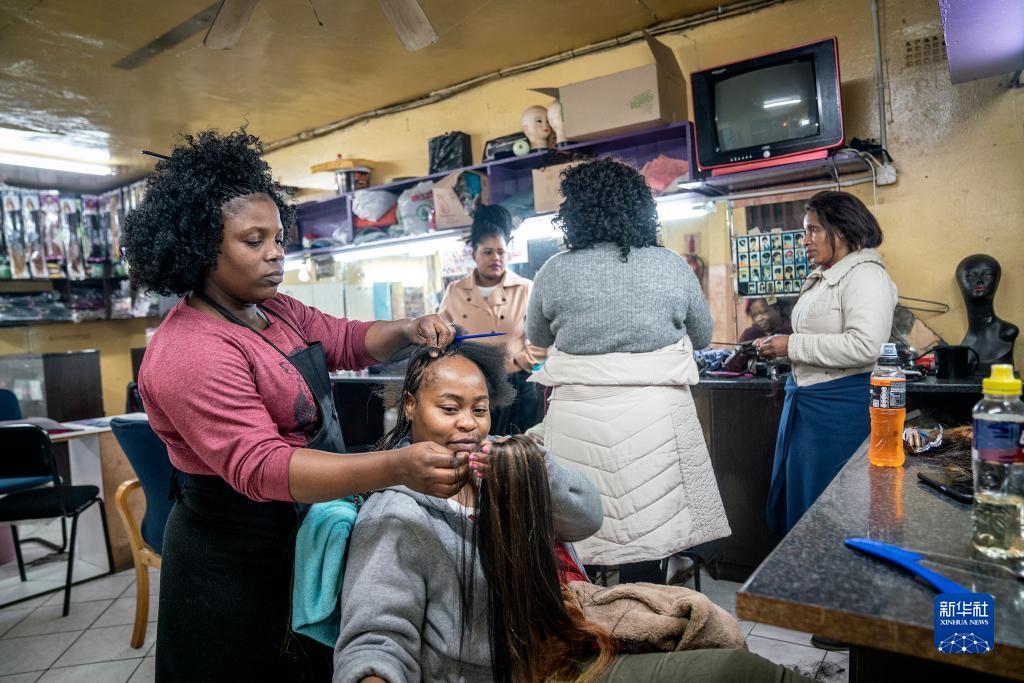6月12日,在南非約翰內斯堡,美發師在美發店內利用假發為顧客造型。