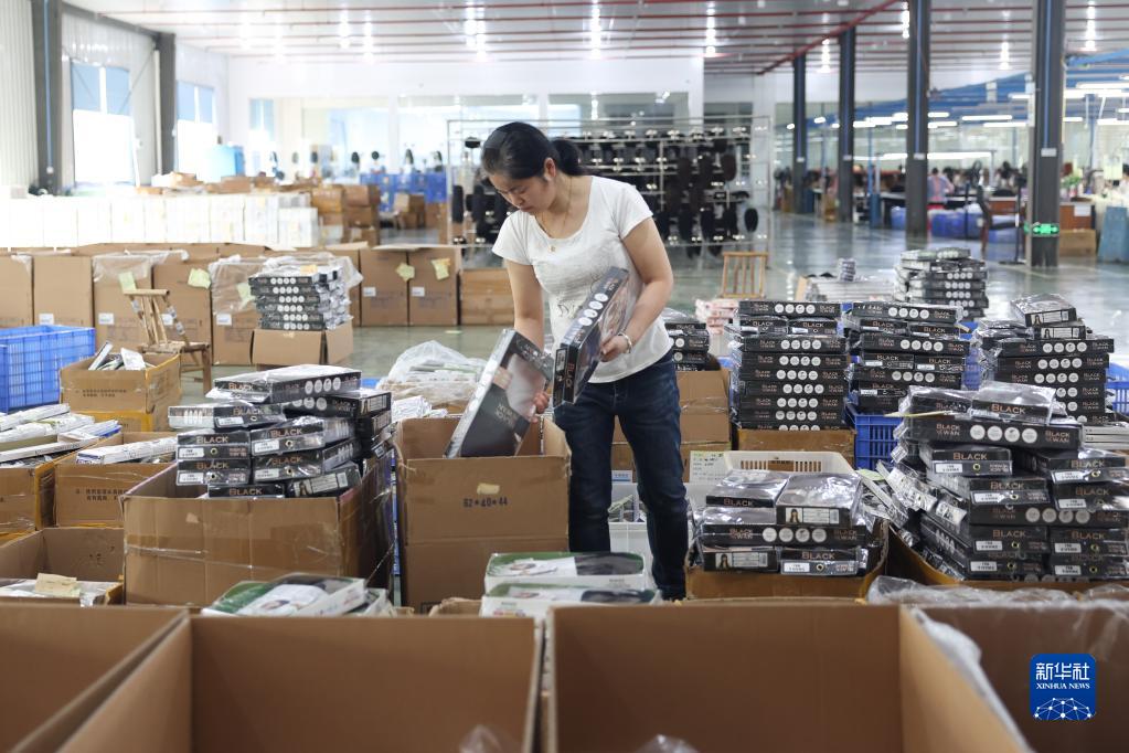 5月25日,工人在湖南邵陽陽光發品有限公司車間打包假發產品。