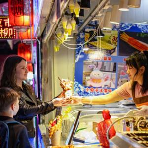 6月27日,俄羅斯游客在琿春市漢唐街夜市選購美食。