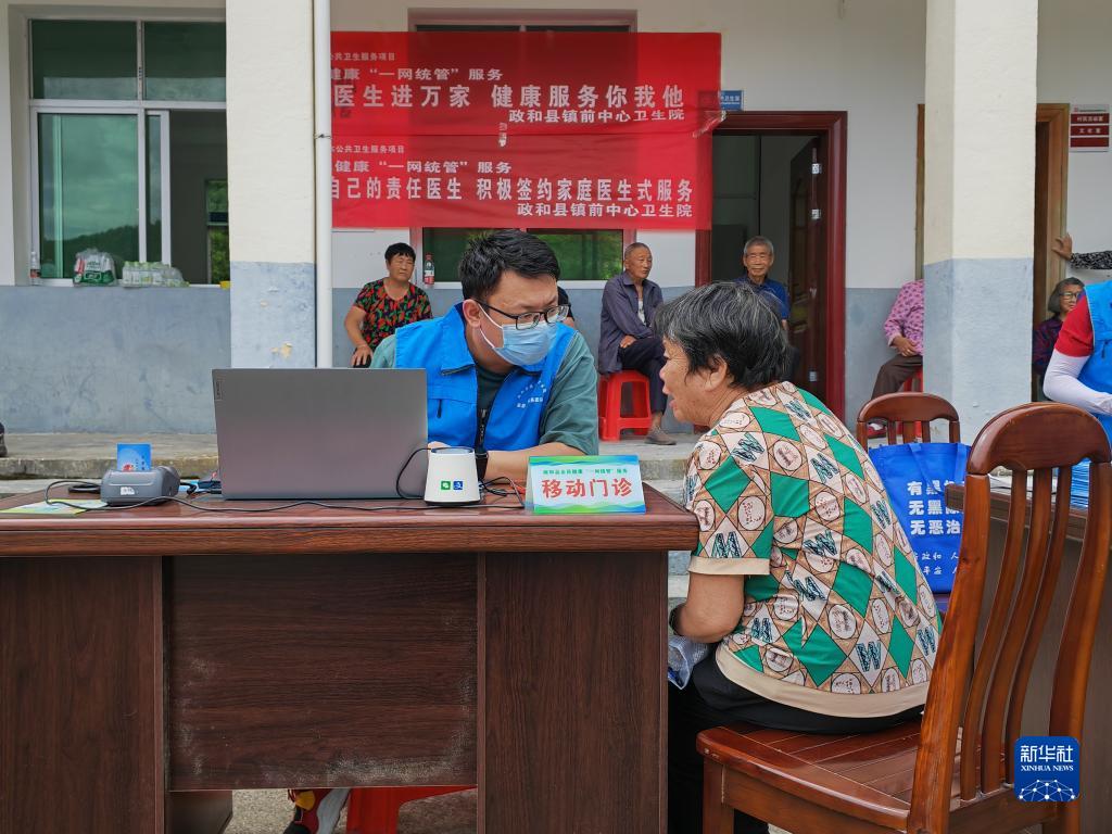 6月27日,在福建省政和縣鎮前鎮西溪村,醫務人員詢問村民患病癥狀等情況。