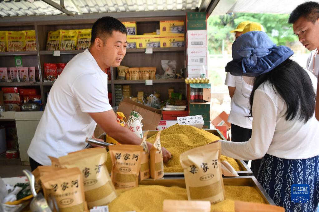 6月28日,游客在延安市延川縣文安驛鎮梁家河村選購農產品。