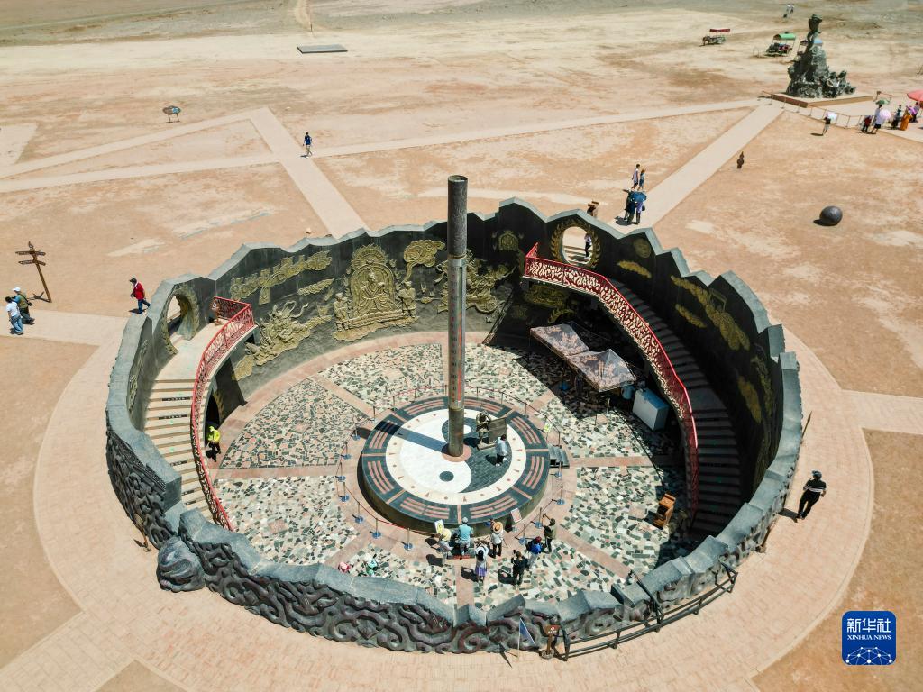 游客在位于吐魯番市的火焰山景區游玩(6月27日攝,無人機照片)。巨型溫度計顯示當時火焰山景區地表溫度約為65攝氏度。