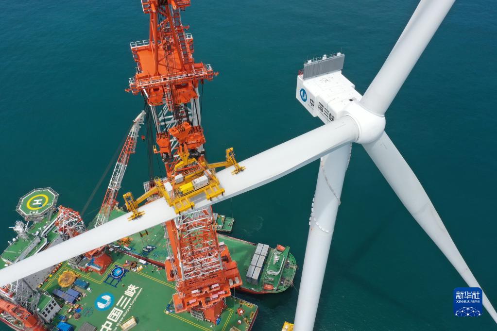 6月28日拍攝的全球首臺16兆瓦海上風電機組吊裝現場(無人機照片)。