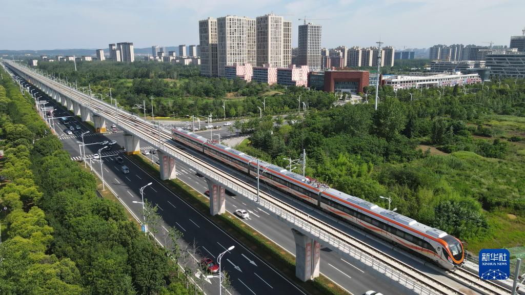 這是在滁州市拍攝的滁寧城際鐵路列車(6月28日攝,無人機照片)。