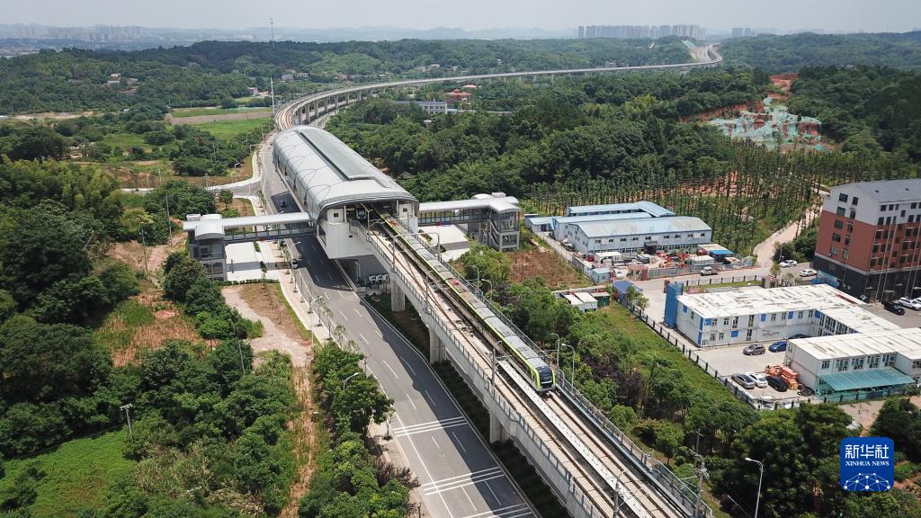 6月28日,列車駛進長株潭城際軌道交通西環線一期工程的高架站點雙湖站(無人機照片)。