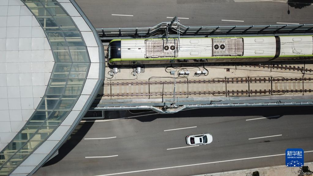 6月28日,列車駛進長株潭城際軌道交通西環線一期工程的高架站點雙湖站(無人機照片)。