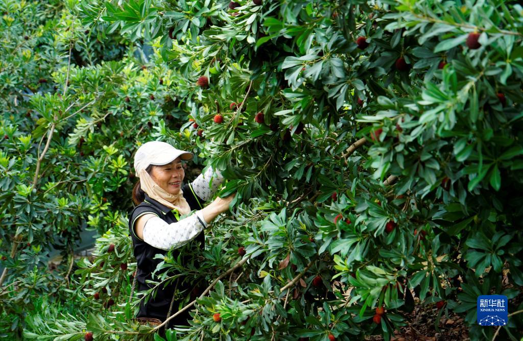 湖南省靖州苗族侗族自治縣渠陽鎮官團村的果農采摘楊梅(6月18日攝)。