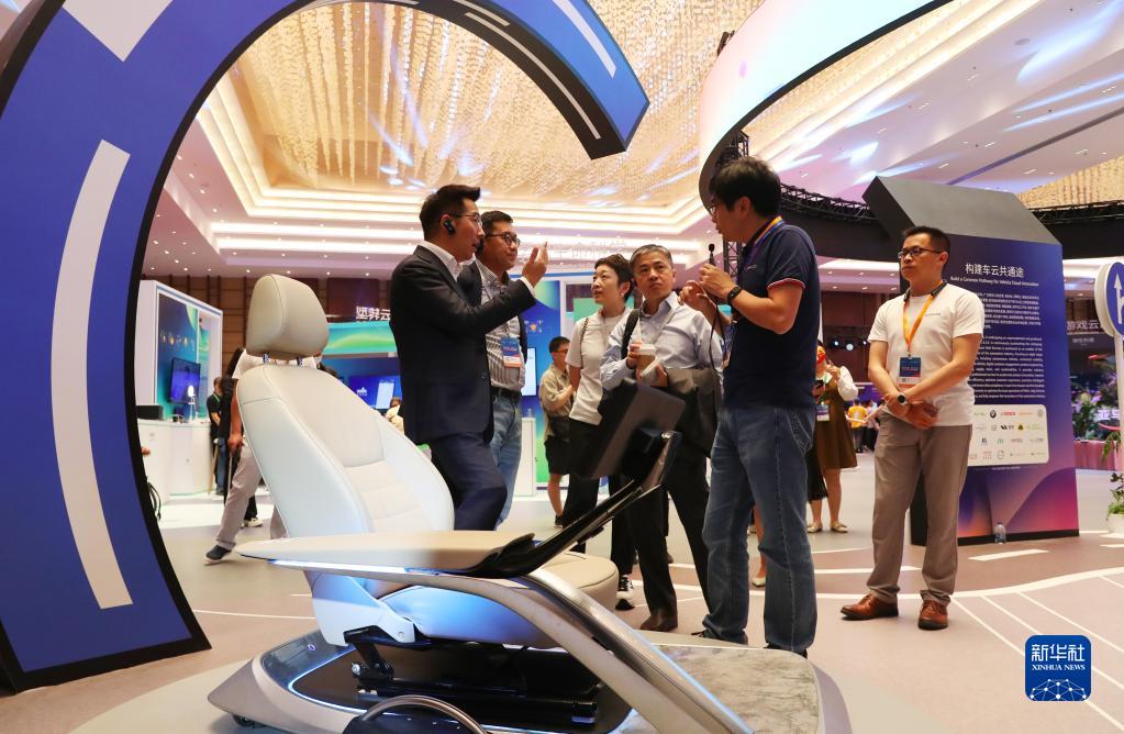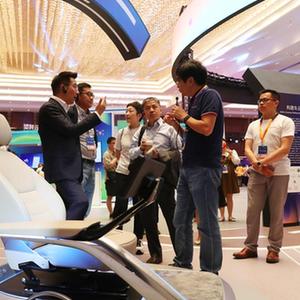 6月28日,參觀者在峰會展示區內的一個智能駕駛座艙展位前交流討論。