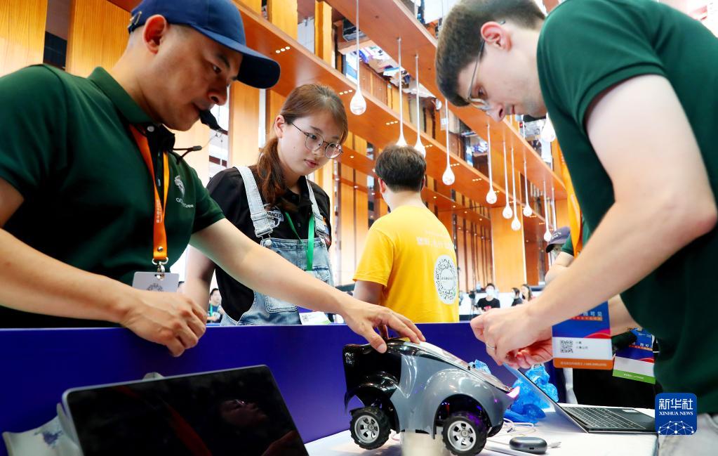 6月28日,來自華東師范大學的全自動駕駛賽車參賽選手(左二)在比賽前等待工作人員安裝統一的車輛外殼。
